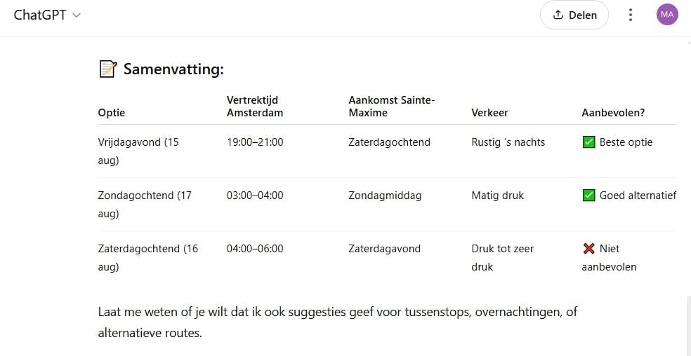Met de auto (inclusief kampeermiddel) op vakantie gaan, kan natuurlijk ook. Wie niet zit te wachten op files, kiest zorgvuldig de ideale vertrektijd. Vooral in de zomervakantie is het erg druk op de snelwegen richting het zuiden. De prompt Vanaf 16 augustus verblijf ik twee weken in de Franse badplaats Sainte-Maxime. Wat is vanuit Amsterdam de ideale vertrektijd om verkeersdrukte te vermijden? biedt goede inzichten.