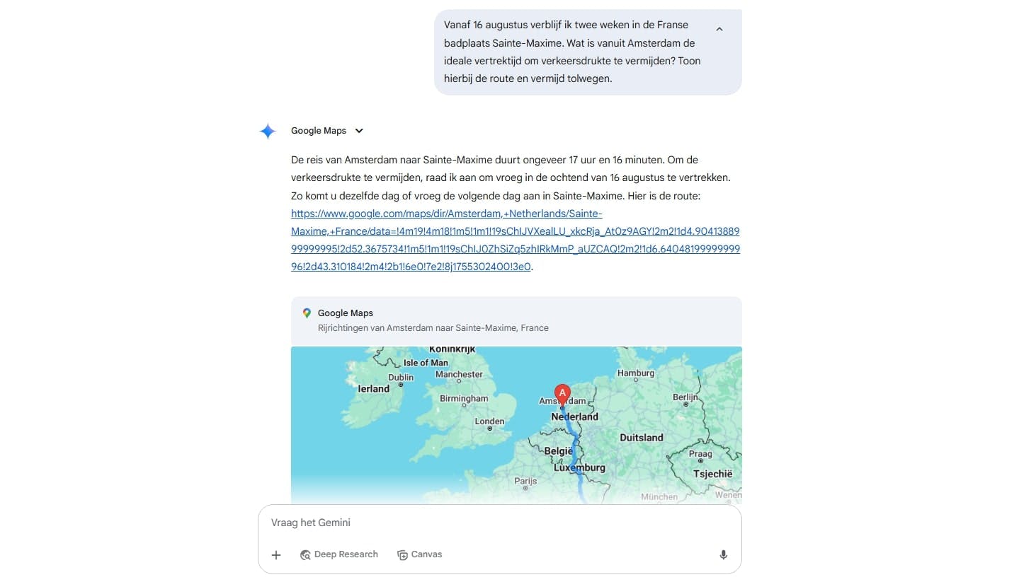 Je breidt de prompt voor jouw ideale autorit naar eigen inzicht uit. Vraag bijvoorbeeld naar een route zonder tolwegen. ChatGPT toont een kort routeschema. De routeplanner in Google Gemini is een stuk uitgebreider, omdat de kaartendienst Google Maps is ingebakken. Je klikt op de link om de autonavigatie te starten.