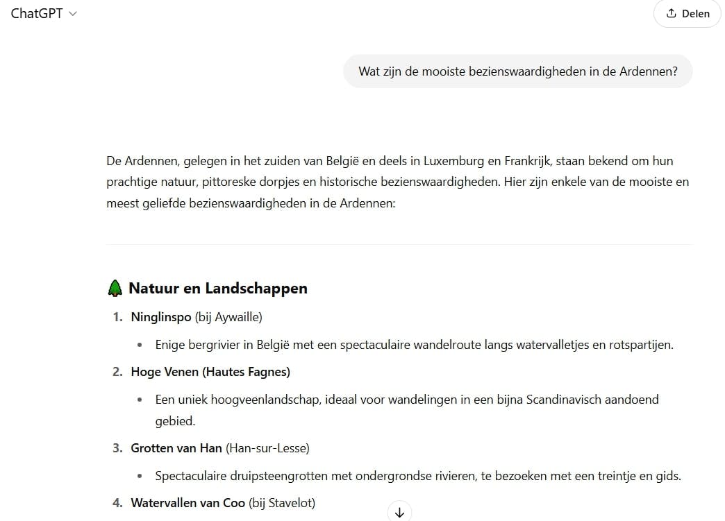 Behalve goede restaurantjes gebruik je AI ook om leuke bezienswaardigheden te vinden. Typ bijvoorbeeld Wat zijn de mooiste bezienswaardigheden in de Ardennen? en er verschijnt een waslijst aan ideeën.