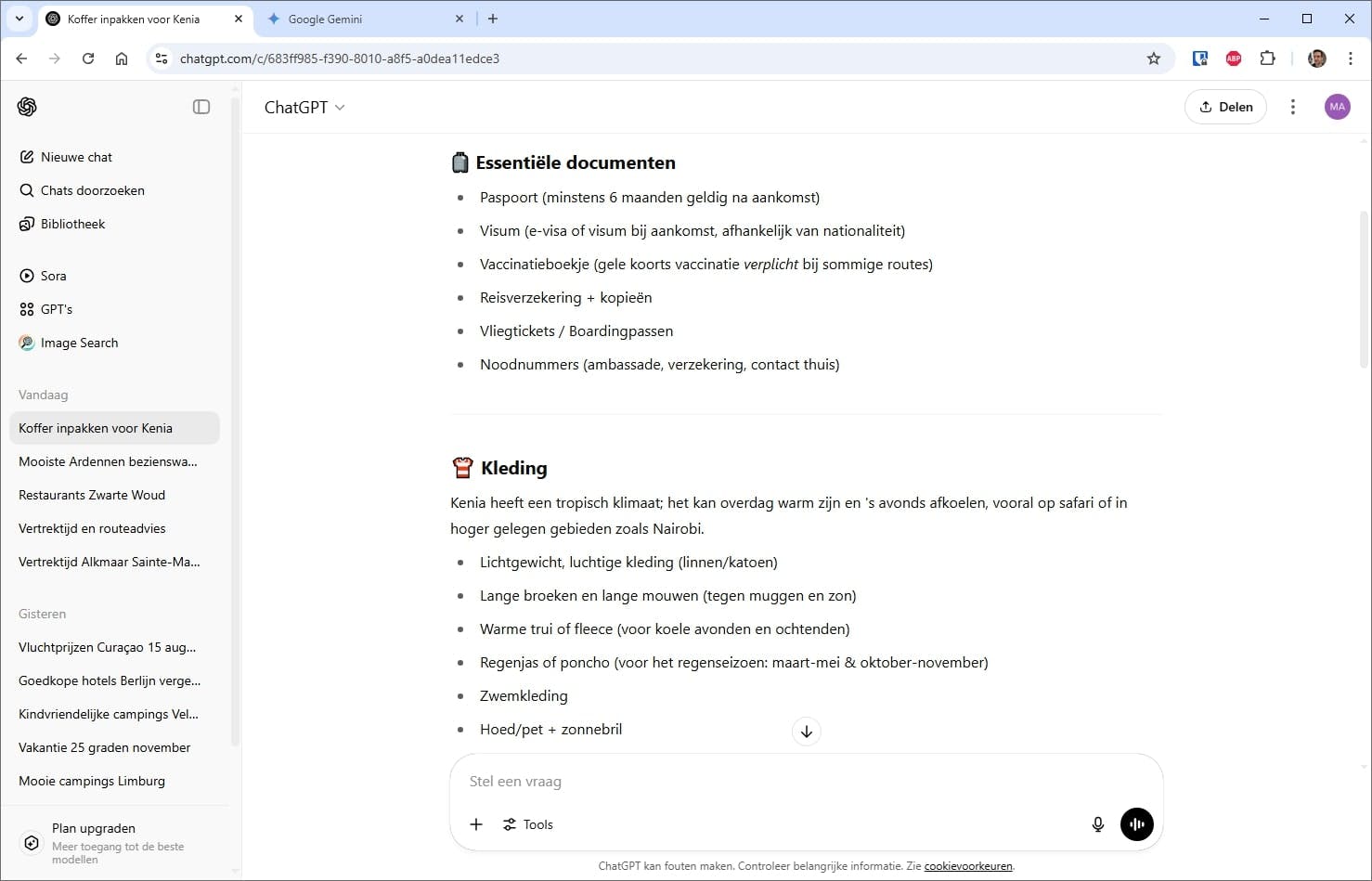 Heb je eenmaal een vakantie geboekt, dan wil je natuurlijk niks vergeten. Laat daarom Google Gemini of ChatGPT een paklijst samenstellen. Na de prompt Wat stop ik in mijn koffer voor mijn vliegreis naar Kenia? verschijnt er een zeer gedetailleerde lijst. Google Gemini adviseert wegens het klimaat om licht ademende kleding mee te nemen. Ga je op safari, dan kies je bij voorkeur voor neutrale kleuren. Felle kleuren kunnen wilde dieren immers afschrikken. Denk in dit voorbeeld verder onder meer aan een wereldstekker, EHBO-set, insectenmiddel, verrekijker, muggennet en malariatabletten. ChatGPT verdeelt alle benodigdheden van de inpaklijst over verschillende categorieën. Wel zo overzichtelijk!