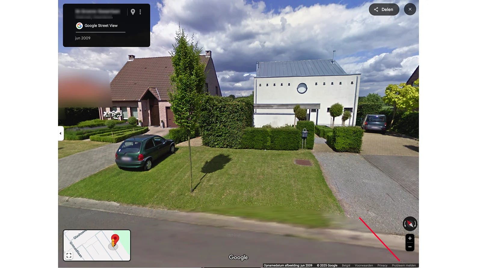 Zodra je dit doet, verschijnt het bekende 360°-beeld van jouw straat. Navigeer door de beelden totdat je woning volledig in beeld is. Zet het huis zo centraal mogelijk in het scherm; dat maakt de volgende stap eenvoudiger. Onderaan het beeld zie je in een dunne, donkere strook de opnamedatum, maar ook de knop waar het ons om te doen is: Probleem melden.