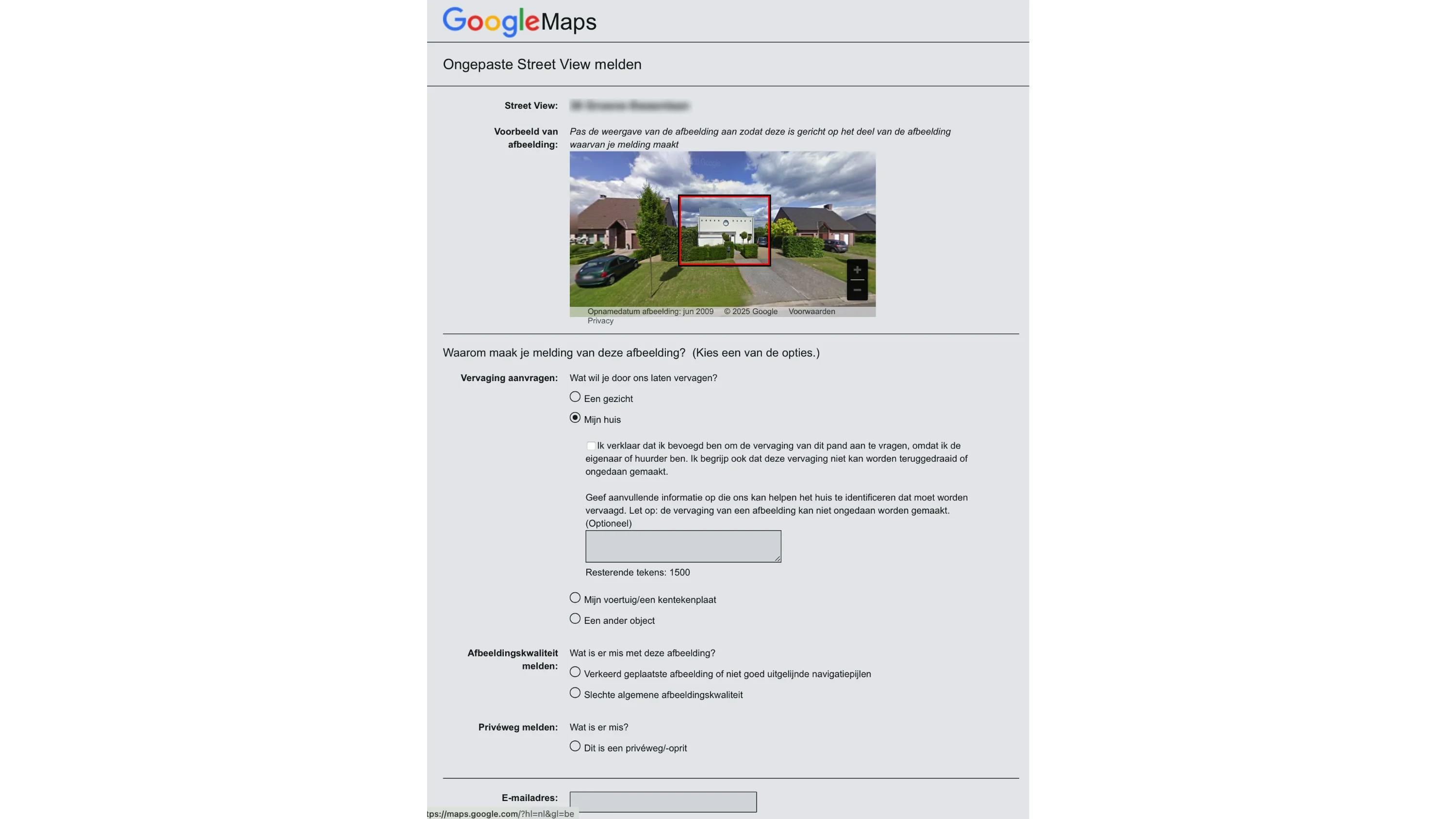 Je komt nu op de Google-pagina Ongepaste Street View melden. Versleep eerst de weergave zodat je woning netjes binnen het rode kader past. Vervolgens geef je aan waarom je de vervaging aanvraagt. Er zijn drie opties: een gezicht, mijn huis of mijn voertuig/een kentekenplaat. Kies uiteraard de tweede mogelijkheid. Het is ook mogelijk om vervaging aan te vragen voor een privéweg of een oprit. Vul zeker je e-mailadres in en klik op Versturen. Na het verzenden ontvang je een e-mail van Google over je aanvraag. Als alles duidelijk is, wordt de vervaging binnen enkele dagen tot weken doorgevoerd. Houd er rekening mee dat je de aanvraag soms meerdere keren moet indienen als je woning vanuit verschillende hoeken zichtbaar is.