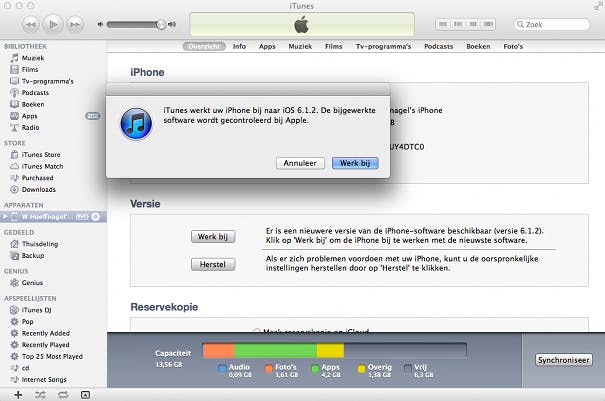 Zodra je een reservekopie hebt gemaakt kan je de iPhone bijwerken tot de laatste versie van het besturingssysteem. Klik hiervoor op je iPhone in het menu aan de linkerzijde van iTunes. Je krijgt nu een overzicht te zien met informatie over je iPhone. Klik op dit scherm op de knop Werk bij. Apple vertelt je nu naar welke versie van iOS de iPhone wordt bijgewerkt. Klik nogmaals op Werk bij om het nieuwe besturingssysteem te installeren.