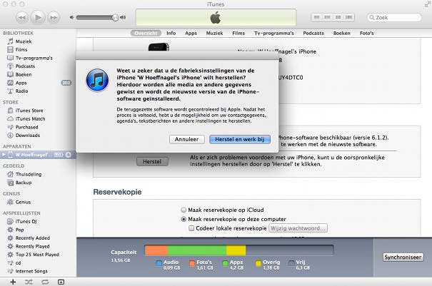 Helpt het niet je iPhone te updaten of heb je al de meest recente versie van iOS iPhone geïnstalleerd? Probeer dan je iPhone te herstellen via iTunes. Je plaatst hierbij een schone versie van iOS op je iPhone. Daarnaast worden de fabrieksinstellingen van de iPhone herstelt en gaan je eigen instellingen dus verloren. Let op! Alle data als video's, muziek, apps en foto's gaan bij het herstellen van je iPhone verloren. Probeer daarom altijd een reservekopie te maken voordat je je iPhone herstelt, zodat je je data in een later stadium terug kunt zetten. Volg voor het maken van een reservekopie de onder 'Update je iPhone' besproken stappen.
