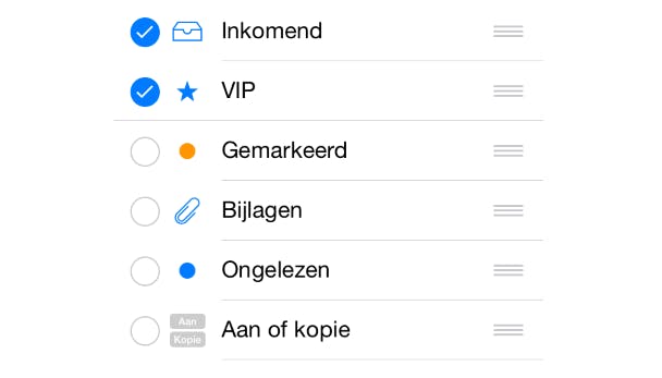 Je kunt mail zoeken met behulp van het zoekveld, maar wat lang niet iedereen weet, is dat je ook kunt zoeken door voorgedefinieerde filters toe te passen op je mail. Wanneer je in Mail bladert naar de pagina Postbussen en drukt op Wijzig, dan kun je postbussen aan het overzicht toevoegen zoals Gemarkeerd, Bijlagen enzovoort. Via dit soort postbussen (eigenlijk gewoon mappen) kun je sneller bladeren door bijvoorbeeld alleen de mails te bekijken die een bijlage hebben.