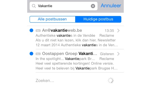 Wanneer je zoekt in Mail voor iOS (alternatieven zijn er ook), dan doorzoek je standaard alle berichten in alle postbussen. Wat echter niet iedereen in de gaten heeft, is dat dat óók het geval is wanneer je eerst naar een bepaalde map bent genavigeerd om daarbinnen een bericht te zoeken. Standaard doorzoekt Mail álle berichten.