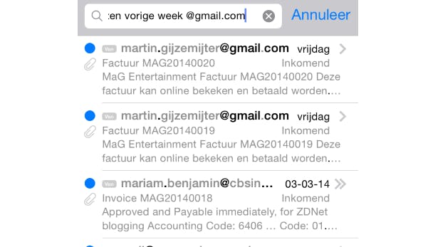 Tot slot zijn er ook nog slimme zoekparameters die je kunt gebruiken om beter te zoeken. Wanneer je bijvoorbeeld zoekt op Gemarkeerd september 2013, worden alleen de berichten uit september 2013 getoond die je hebt gemarkeerd. Typ je Ongelezen vorige week van @gmail.com, dan krijg je alleen de ongelezen mails te zien van mensen met een Gmail-account die je vorige week een mailtje hebben gestuurd. Tot slot kun je bijvoorbeeld ook zoeken op VIP gelezen gisteren, waarmee je alleen de mails te zien krijgt van iemand die jij hebt toegevoegd als VIP en die je gisteren hebt ontvangen én gelezen.