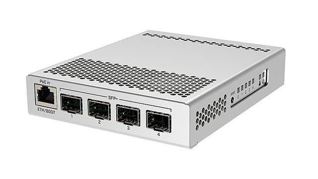 De MikroTik CRS305-1G-4S+IN is één van de allergoedkoopste 10gigabit-switches op de markt. Hij is met 140 euro echt een prijsbreker, er is geen ander product dat vier snelle SPF+-poorten biedt voor deze prijs. Hij is als een domme switch te gebruiken, maar kan ook managed gebruikt worden en dat zelfs met L3-functionaliteit die menig zakelijke switch niet eens biedt. Het voornaamste nadeel is dat je met vier poorten beperkt bent tot drie werkplekken plus één server, en dat je circa twee tientjes per poort moet uitrekenen voor een transceiver of een paar euro meer voor een RJ45-converter als je pc’s op RJ45 gebaseerd zijn.