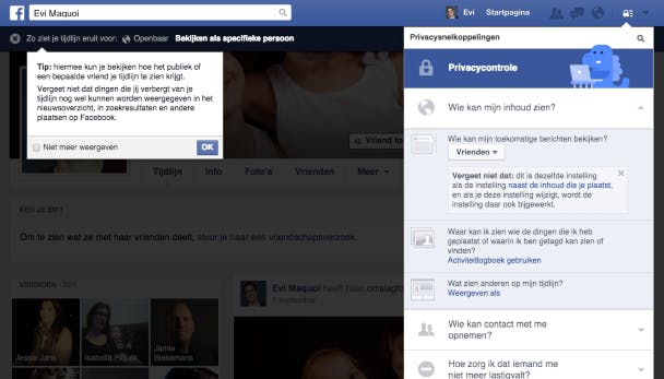 Ten slotte is het ook handig om eens te weten hoe anderen jouw pagina zien. Klik hiervoor bovenaan op de blauwe balk op de knop met het hangslotje en kies Wie kan mijn inhoud zien? / Wat zien anderen op mijn tijdlijn? / Weergeven als. Standaard kom je eerst terecht op Openbaar, maar je kunt je tijdlijn ook bekijken als een specifieke persoon.