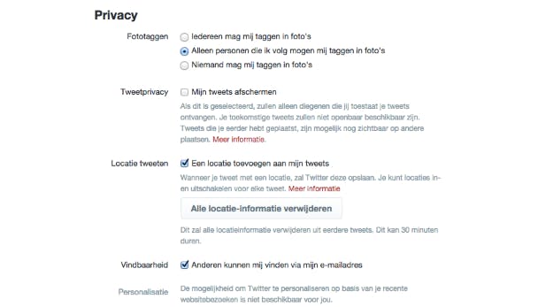Op die manier kunnen enkel tweeps die jij toestemming geeft je volgen. Via Locatie tweeten kun je aangeven of je locatie gedeeld mag worden. Wil je dit uitschakelen, dan volstaat het om het vakje uit te vinken. Via Alle locatie-informatie verwijderen kun je de locaties uit eerdere tweets ook wegwerken. Vergeet niet op Wijzigingen opslaan te klikken als je aanpassingen hebt doorgevoerd.