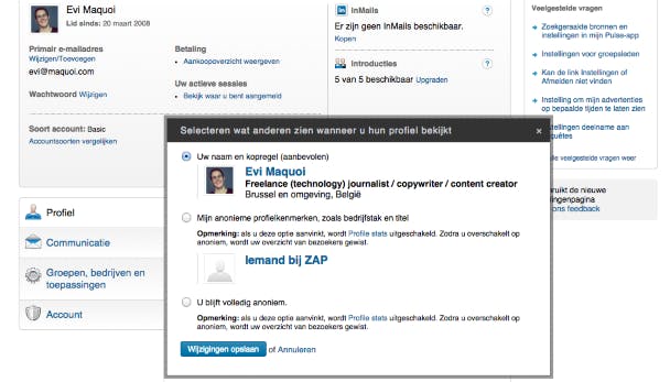 Wellicht heb je op de startpagina weleens gezien wie je LinkedIn-profiel bekeken heeft. Meestal staat hier de voor- en achternaam, de functie die hij of zij uitoefent en de regio waar deze persoon werkt. Bezoek jij het profiel van iemand? Dan krijgt hij of zij dat ook te zien. Je kunt deze functie eenvoudig uitschakelen. Weet wel dat jij dan ook niet meer te zien krijgt wie jouw profiel bezoekt. Klik hiervoor centraal onderaan op Selecteren wat anderen zien wanneer u hun profiel bekijkt. Je krijgt drie mogelijke weergaven: Uw naam en kopregel, Anonieme profielkenmerken zoals bedrijfstak en titel en U blijft volledig anoniem. Maak je keuze en voltooi met Wijzigingen opslaan.