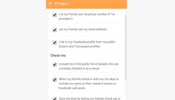 Gebruik je de locatiegebaseerde app Swarm? Dan raden we je zeker aan om zuinig te zijn met het aantal vrienden dat je toestemming verleent. Bovendien is het ook niet echt slim om elke check-in op Facebook of Twitter te delen, want zo weten heel veel mensen dat je niet thuis bent. Via Settings / Privacy Settings kun je vervolgens nog aangeven of je vrienden je telefoonnummer, e-mailadres en Facebook-profiel kunnen zien. Standaard staat dit ingeschakeld, dus je kunt maar beter zo snel mogelijk schoon schip maken. Kijk alle instellingen onder Check-ins nog even door, om bijvoorbeeld te voorkomen dat vrienden jou kunnen inchecken. Ga rustig door de lijst met opties heen (die standaard allemaal aangevinkt zijn) en schakel uit wat je onnodig acht.