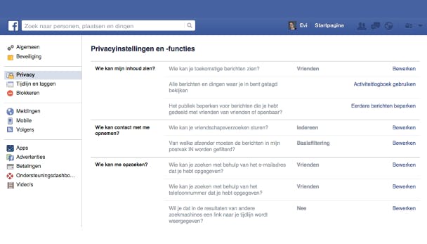 Wil je toegang tot alle instellingen van Facebook? Dan klik je uiterst rechts bovenaan in de blauwe balk op de knop met het driehoekje en kies je Instellingen. In de linkermarge zie je vervolgens allerlei rubrieken. We lichten er de belangrijkste uit. Op het tabblad Beveiliging kun je onder andere Aanmeldgoedkeuringen instellen om te voorkomen dat iemand anders inlogt met jouw account. Klik op Bewerken en vink Om een beveiligingscode vragen aan. Ga verder met Wijzigingen opslaan. Dankzij deze extra beveiligingslaag ontvang je een code op je telefoon die je nodig hebt om via een onbekende browser in te loggen.