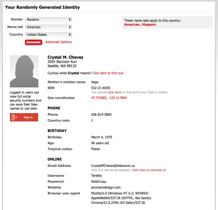Bij het aanmaken van je e-mailadres is het vaak al nodig: je moet een voor- en achternaam opgeven. Regelmatig is het bovendien nodig om een adres op te geven en soms ook een telefoonnummer en meer. Als je regelmatig dezelfde neppe online-identiteit gebruikt, kan deze alsnog worden gekoppeld aan je echte identiteit door middel van slimme technieken. Het is beter om een compleet anonieme, willekeurige identiteit te genereren. Daarvoor heb je bijvoorbeeld een dienst als www.fakenamegenerator.com. Zodra je de website bezoekt, staat er direct een nieuwe identiteit voor je klaar, compleet met een eigen en werkend e-mailadres, een leeftijd en geboortedatum, een baan en zelfs een favoriete kleur. Je kunt bovenin nog een aantal opties aanpassen, zoals het geslacht, van welk land de naam afkomstig is en van welke land de identiteit is. Als je klikt op Advanced Options kun je verder nog het leeftijdsinterval instellen en de kans op welk geslacht de willekeurige identiteit wordt, aanpassen.