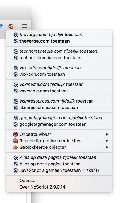 NoScript blokkeert op onbekende websites JavaScript, waardoor deze scriptbestanden niet zomaar willekeurige code kunnen uitvoeren. Naast JavaScript blokkeert NoScript ook Java en Flash. Dat verhoogt niet alleen de veiligheid, maar ook je privacy omdat het helpt tegen bijvoorbeeld ‘browserfingerprinting’ (zie tip 12). De add-on NoScript is beschikbaar voor Mozilla Firefox en Google Chrome en een must voor iedereen die anoniem online wil zijn. Voor Mozilla Firefox download je deze add-on hier. Klik op Toevoegen aan Firefox en daarna op Installeren. Herstart even de browser om de add-on actief te maken. Daarna wordt het introscherm van NoScript getoond. Het icoon rechtsboven verandert automatisch op basis van wat er op de pagina aanwezig is. Als je een S ziet met een rode streep erdoorheen, dan betekent dat dat scripts en plug-ins actief worden geblokkeerd. Zie je een kleine, rode streep, dan betekent dat dat alleen van de website scripts zijn toegestaan, maar niet van andere subdomeinen. Als je bij het bezoeken van een website klikt op het NoScript-logo, kun je zien welke inhoud er allemaal geblokkeerd is. Je kunt dan eventueel individuele items nog toestaan.
