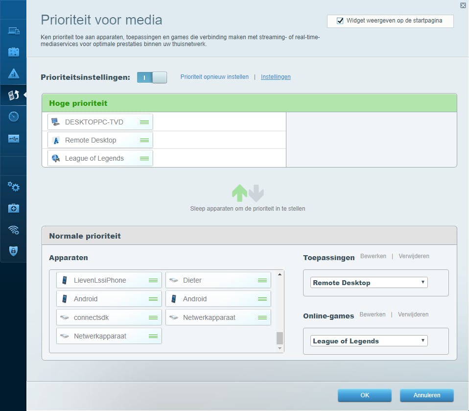 Hoe je de QoS-functie precies aanstuurt, hangt van je router af. Op een Linksys Smart Wi-Fi EA6400-router bijvoorbeeld moet je in de rubriek Prioriteit voor media zijn, waar je Prioriteitsinstellingen inschakelt. Vervolgens kun je een of meer netwerktoestellen, applicaties of online games uit een lijst simpelweg verslepen naar de rubriek Hoge prioriteit. Bij Instellingen vul je tevens een correcte Downstreambandbreedte in. Op je eigen router kunnen deze opties net weer anders zijn.