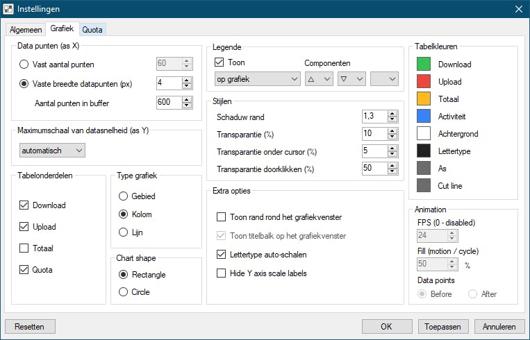 Rechtsklik op het programma-icoontje in het Windows-systeemvak en kies voor Instellingen. Open het tabblad Grafiek om het grafiekvenster geheel naar wens aan te kunnen passen. Je beslist zelf welke informatie je in de grafiek wilt zien, in welke kleuren en met welke visualisatie. Op het tabblad Algemeen, bij Data source kun je tevens aanvinken van welke netwerkadapter(s) NetTraffic het verkeer in kaart moet brengen.