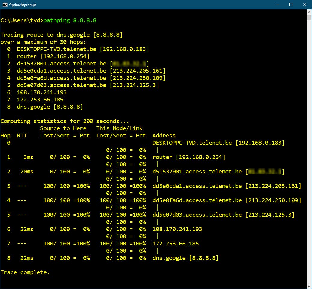 Bij het uitmeten van de doorvoersnelheid moet je ook rekening houden met de latentie (vertraging, latency in het Engels). Dat is de tijd tussen het versturen van het eerste verzoek om data en het daadwerkelijk beginnen ontvangen van data. Die vertraging hangt van diverse factoren af, waaronder het medium zelf. Zo zit op een doorsnee kabel- of dsl-verbinding vaak een latentietijd van een paar tientallen milliseconden. Maar er zijn nog meer factoren, zoals antivirussoftware, proxyservers, slecht geconfigureerde hardware, tussenliggende routers enzovoort. Met het opdrachtregelcommando ping kun je dergelijke latentietijden aan het licht brengen en met tracert kun je potentiële knelpunten detecteren. Of je gebruikt het commando *pathping