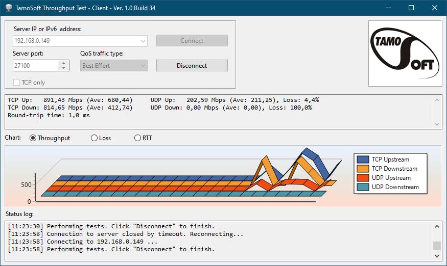 Zijn beide systemen mooi op elkaar afgestemd, dan druk je de Connect-knop in aan clientzijde. Als het goed is, wordt meteen een grafiek uitgetekend die in realtime de doorvoersnelheden vastlegt. Standaard wordt het verkeer in beide richtingen gemeten, zowel voor TCP als UDP. Plaats een vinkje bij TCP only als je alleen in dit protocol geïnteresseerd bent. Aan clientzijde kun je voor je tests bovendien een zogeheten QoS traffic type simuleren. De optie Best Effort toont de normale tijden (zonder QoS) en AudioVideo simuleert voor videostreaming geoptimaliseerde QoS-waarden.
