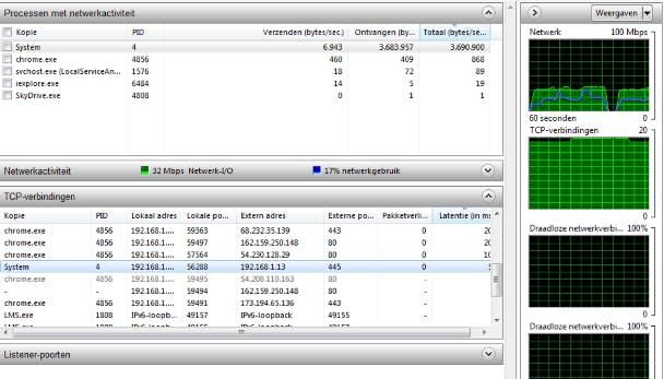 Is maar één pc traag, open dan via Ctrl+Alt+Del het Taakbeheer. Klik op het tabblad Prestaties en daarna op Broncontrole. In dit venster kun je heel veel informatie over de werking van de pc vinden. Klik op Netwerk. Bovenin het venster zie je alle processen op de computer die het netwerk gebruiken. Vaak steekt er dan één proces bovenuit dat veruit het meeste netwerkverkeer veroorzaakt. Klik vervolgens onderin het venster op TCP-verbindingen en spoor in deze lijst hetzelfde proces op. In de kolom Extern adres kun je nu zien waarmee dat proces communiceert. Is het een adres op het internet of een uit het thuisnetwerk? Wil je de grootverbruiker stoppen, klik dan met de rechtermuisknop op het proces en kies Proces beëindigen.