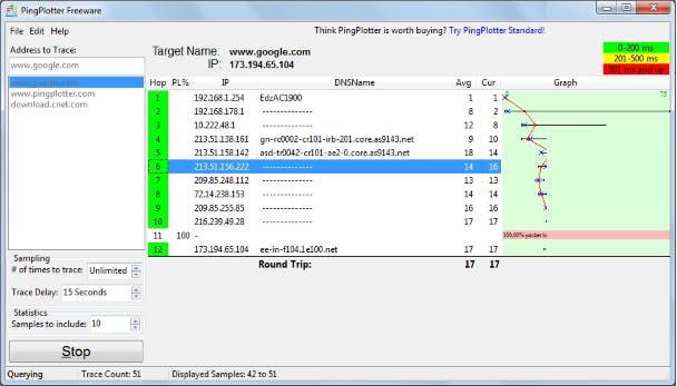 Een gratis hulpprogramma als PingPlotter toont de snelheid van de verbinding in een grafiek.