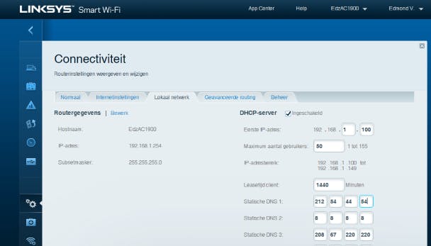 Gebruik je DHCP om de apparaten te configureren dan krijgen alle apparaten daarbij ook meteen het adres van de DNS-server mee. Vaak dus het adres van de router die ook DNS-server is. Als alle apparaten maar één DNS-server kennen, maakt dat het systeem wel storingsgevoelig. Je kunt op een pc tot wel drie DNS-servers configureren. Je kunt dan bijvoorbeeld ook een DNS-server van de provider opgeven en een van de publieke DNS-servers van Google of OpenDNS. Log in op de router en ga naar de DHCP-instellingen. Klik bij Statische DNS en voer hier de aanvullende DNS-servers in. De IP-adressen van de DNS-servers van de internetprovider vindt je op de website van de provider, die van Google zijn 8.8.8.8 en 4.4.4.4 en die van OpenDNS zijn 208.67.222.222 en 208.67.220.220. Bevestig met Toepassen of OK.