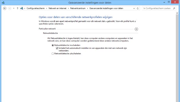 Kies altijd een IP-adres op hetzelfde netwerk, anders zal Windows de printer zeker niet vinden, de netwerkscan naar nieuwe apparaten gaat namelijk niet verder dan het eigen netwerk. Bij bluetooth-printers en printers die draadloos verbonden zijn, is het belangrijk dat de printer echt ingeschakeld is. Staat de printer in slaapstand, dan wordt deze vaak niet gevonden. Activeer de printer daarom als deze niet gevonden wordt, bijvoorbeeld door deze even uit en weer in te schakelen. Belangrijk is dat onder Windows zelf de netwerkdetectie is ingeschakeld. Klik hiervoor met de rechtermuisknop op het pictogram van de netwerkverbinding in de taakbalk. Kies Netwerkcentrum openen. Klik op Geavanceerde instellingen / Particulier netwerk / Netwerkdetectie inschakelen.