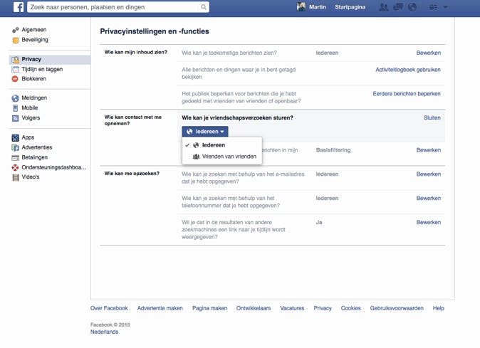Onder het kopje Wie kan contact met me opnemen? heb je twee opties: Iedereen en Vrienden van vrienden. Dat laatste is een veilige optie, omdat je dan alleen kunt worden toegevoegd door mensen die vrienden zijn van je huidige Facebook-vrienden en dan treedt er direct een soort sociale controle in werking. Daarnaast kun je ook voorkomen dat je berichtenbox in Facebook volloopt met spamberichten, door onder het kopje Wie kan contact met me opnemen? te klikken op Bewerken naast Basisfiltering en te kiezen voor Strikte filtering. Berichten die niet van je vrienden afkomstig zijn, komen dan in het postvak Overig terecht.