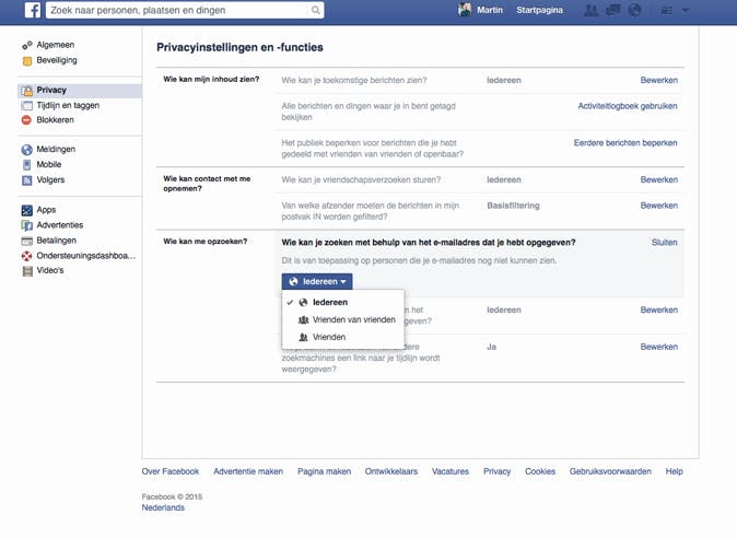 Onder Instellingen > Privacy kun je onder het kopje Wie kan me opzoeken? aangeven dat iedereen je kan vinden aan de hand van je e-mailadres of telefoonnummer, of alleen je vrienden of vrienden van vrienden. Opmerkelijk genoeg is de optie Niemand hier niet aanwezig. Onderin kun je tot slot nog aangeven of je tijdlijn mag worden weergegeven in de resultaten van bijvoorbeeld Google.