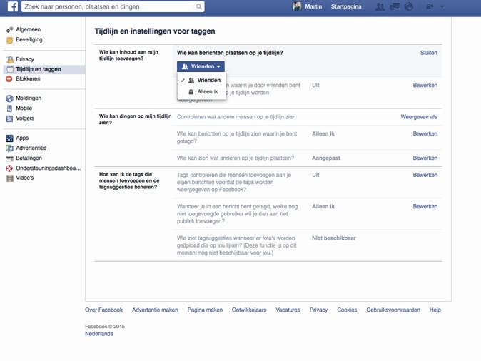 Je hebt nu onder andere afgekaderd wat de zichtbaarheid is van dingen die je zelf op Facebook plaatst, maar hoe zit het met anderen? Een leuke, maar ook opdringerige functie van Facebook is namelijk de mogelijkheid om een bericht op de tijdlijn van een ander te plaatsen. Dit kan erg vervelend zijn wanneer je je ziek hebt gemeld en een vriend je doodleuk tagt in een foto waarop jullie samen op een terrasje zitten, om maar een voorbeeld te noemen. Gelukkig kun je dit reguleren door in Instellingen te klikken op Tijdlijn en taggen. Door bij Wie kan berichten plaatsen op je Tijdlijn? te kiezen voor Alleen ik hoef je je over taggende vrienden geen zorgen meer te maken.