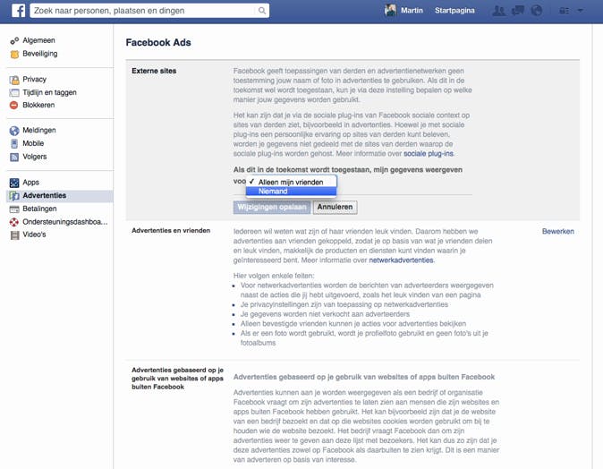 Wat Facebook al jaren doet, is advertenties aan je tonen van bijvoorbeeld pagina's, waarbij wordt aangegeven wie van je vrienden die pagina al 'liken'. Als jij niet in dit soort advertenties wilt worden opgenomen, dan kun je dat ook uitschakelen. Klik bij Advertenties en vrienden op Bewerken en kies voor Niemand in plaats van Alleen mijn vrienden. Je wordt nu niet meer 'gebruikt' voor dit soort advertenties. Overigens raden we je aan om deze instellingen eens in de zoveel tijd door te lopen, omdat Facebook regelmatig veranderingen doorvoert.