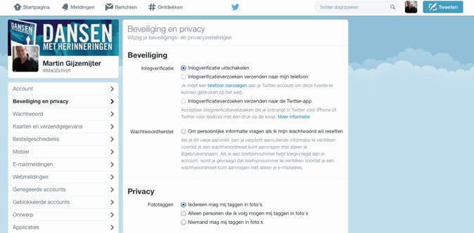 Net als Facebook geeft Twitter de mogeijkheid tot het instellen van een inlogverificatie. Daarvoor ga je naar Instellingen > Beveiliging en Privacy en zet je een vinkje bij Inlogverificatieverzoeken. Je krijgt iedere keer als je je probeert aan te melden een bericht op je telefoon (als je tenminste je mobiele nummer hebt opgegeven). Zo wordt het voor inbrekers niet alleen ontzettend moeilijk je accunt over te nemen, maar weet jij ook nog eens precies waneer iemand dat probeert. Zelfs met inlogverificatie is het niet onmogelijk dat iemand je account verneemt en zich als jou probeert vooor te doen, maar de kans wordt in elk geval vele malen kleiner.