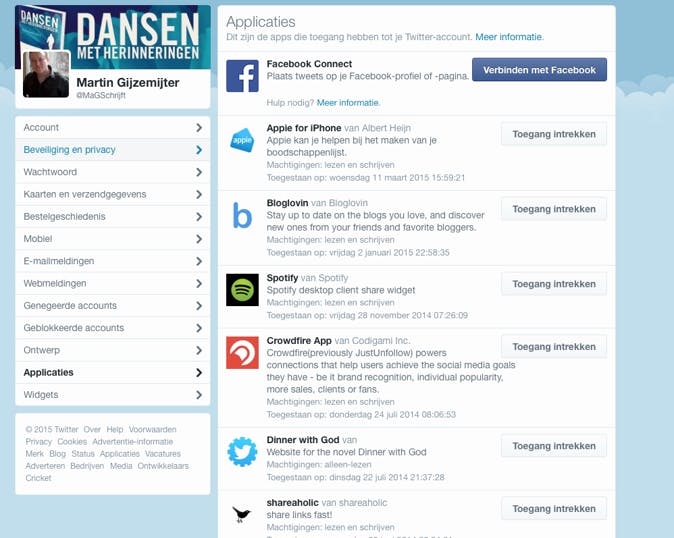 Er is een vergelijking te maken tussen Facebook en Twitter, want ook Twitter biedt de mogelijkheid tot het koppelen van apps (oftewel de mogelijkheid om met je Twitter-account in te loggen op websites van derden). Hoewel hierbij wederom geldt dat er op Twitter doorgaans minder gevoelige informatie (in je profiel) staat dan bij Facebook (meer dan een url, een profielnaam en een e-mailadres hoef je niet in te vullen), wil dat wederom niet zeggen dat zomaar iedereen toegang moet hebben tot die informatie. Klik op het tabblad Applicaties in Instellingen om te bekijken welke apps toegang hebben tot je Twitter-informatie. Klik vervolgens op de knop Toegang intrekken achter de apps die je niet langer aan je account wilt hebben gekoppeld. Wees niet bang om verkeerd te klikken, je kunt een website/app net zo makkelijk opnieuw toegang geven.