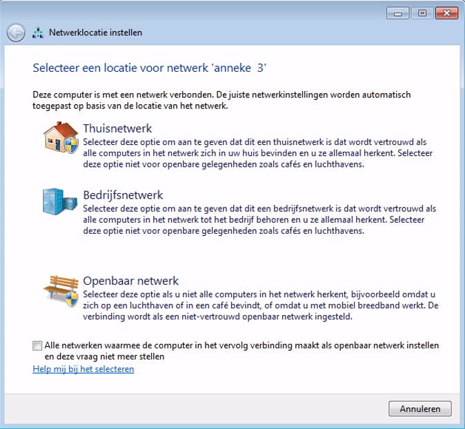 Thuis kan het fijn zijn om bestanden te delen met je andere computers, maar op een publiek wifi-netwerk is het delen van bestanden en media (foto's, filmpjes) niet wenselijk. De eerste keer dat je verbinding maakt met een draadloos netwerk, vraagt Windows om een netwerktype te kiezen. Deze keuze bepaalt of je mogelijk dingen gaat delen. Bij Windows 7 heb je de keuze voor Thuisnetwerk, Bedrijfsnetwerk of Openbaar netwerk. Kies met Openbaar netwerk voor de veiligste instelling, tenzij je je thuis op je eigen netwerk bevindt of als een andere instelling op je werk noodzakelijk is. Met het profiel Openbaar netwerk wordt alles automatisch uitgeschakeld wat met het delen van bestanden te maken heeft.
