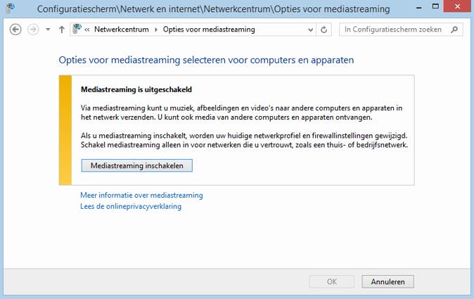 Windows kan foto's, films en muziek verzenden (streamen) naar andere apparaten in hetzelfde netwerk. Afhankelijk van je instellingen kun je via je tv bij de foto's, films en muziek op je computer. Op een gratis wifi-netwerk wil je natuurlijk niet dat deze gegevens bereikbaar zijn. Ga naar Configuratiescherm / Netwerk en internet / Netwerkcentrum / Opties voor mediastreaming. Als je iets anders ziet staan dan de knop Mediastreaming inschakelen, deel je mogelijk persoonlijke media met je mede-netwerkgebruikers. Klik op Alle blokkeren en bevestig met OK. Ga opnieuw naar Opties voor mediastreaming. Als het goed is, zie je nu wel de knop Mediastreaming inschakelen en weet je dat je geen media deelt via dit Windows-onderdeel.