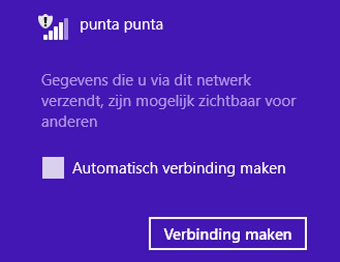 In Windows 8.1 is de keuze beperkter dan bij Windows 7.1. Nadat je je hebt aangemeld bij een wifi-netwerk, krijg je de vraag of je iets wilt delen met andere apparaten in het netwerk. Dit is bedoeld om bijvoorbeeld een (draadloze) netwerkprinter te gebruiken of je tv toegang te geven tot media op je computer. Beantwoord de ja/nee-vraag altijd met Nee als je je op het netwerk van iemand anders bevindt. Als je verbinding maakt met je thuisnetwerk, kun je (als je dat nodig vindt) de vraag met Ja beantwoorden.