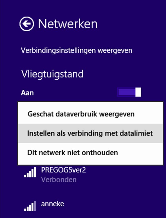 Een persoonlijke wifi-hotspot (zie tip 13 en 14) is veiliger dan een publiek wifi-netwerk, maar heeft een ander nadeel. Je computer herkent de wifi-verbinding van je persoonlijke wifi-hotspot namelijk niet als een 3G/4G-internetverbinding waarbij je soms per megabyte afrekent. Allerlei programma's (zoals clouddiensten en update-functies) zullen de verbinding gebruiken om zichzelf bij te werken. Als je alleen even van plan was om je mail op te halen of reisinformatie op te zoeken, verbruik je snel vele (tientallen) MB's. Maak dus alleen verbinding met je persoonlijke wifi-hotspot als je verbinding expliciet gaat gebruiken (zie tip 11). Windows 8.1-gebruikers kunnen nog een aanpassing maken. Ga naar Charms-balk / Instellingen en klik op je draadloze netwerk. Klik met de rechtermuisknop op de verbinding en kies Instellen als verbinding met datalimiet. Hiermee wordt het dataverkeer zo veel mogelijk beperkt.