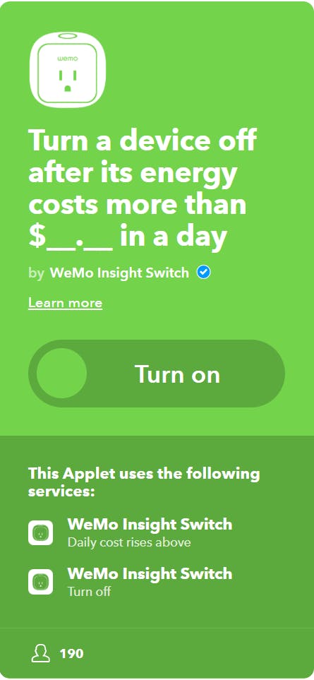 Deze tip is specifiek voor gebruikers van de Wemo Insight Switch. Eenmaal ingesteld kan het slimme stopcontact het energieverbruik van het aangesloten apparaat monitoren. Met IFTTT kun je instellen dat het stopcontact zichzelf automatisch uitschakelt nadat het een bepaalde hoeveelheid stroom heeft gebruikt. Kies bij het recept ‘daily cost rises above’ als ‘if’ en stel een bedrag in centen in. Als ‘that’ selecteer je dat het betreffende stopcontact uitgaat.