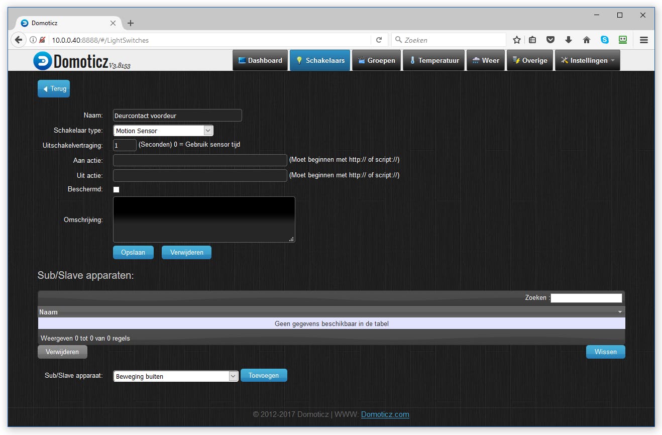 Met een raam/deursensor of bewegingssensor zijn leuke toepassingen mogelijk, van een inbraakbeveiliging tijdens de vakantie tot het inschakelen van verlichting bij beweging. Op Chinese webshops vind je zulke sensoren al voor een paar euro. De meeste gebruiken de PT2262-chip. Enkele sensoren melden alleen het openen van de deur met aan-signaal, niet het sluiten daarvan. Zo’n sensor kun je in Domoticz het beste toevoegen als bewegingssensor met uitschakelvertraging van bijvoorbeeld 1 seconde, zodat de sensor na het ‘signaleren’ weer op ‘uit’ staat.
