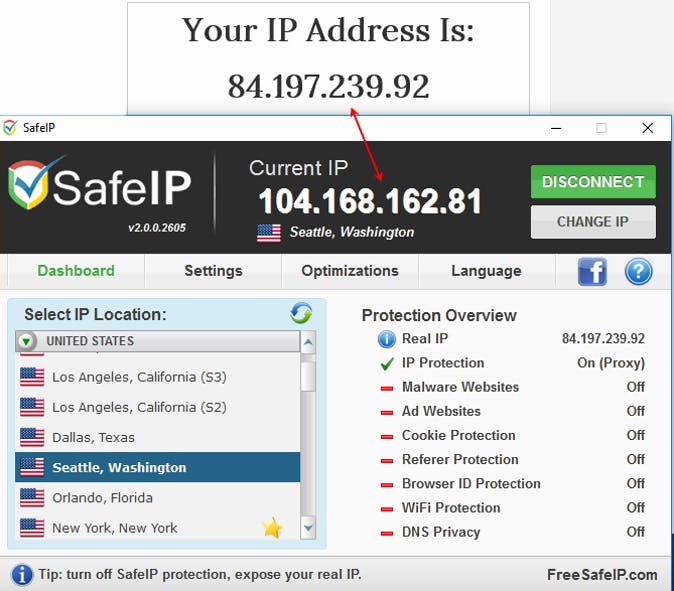 In tip 5 hebben we het even gehad over een proxyserver. Dat is een server die zich tussen je eigen pc en de beoogde webserver bevindt. Bezoek je de webserver, dan krijgt die het IP-adres van die proxy te zien en niet jouw IP-adres. Nu bestaan er verschillende tools en services die je - vaak gratis - een of meer proxyservers laten gebruiken, zoals bijvoorbeeld SafeIP. Toch is het even opletten geblazen, want je zulke (gratis) servers zijn vaak erg traag en je weet niet hoe betrouwbaar de uitbaters zijn. Bovendien zijn sommige proxyservers van het 'transparante' type, wat inhoudt dat ze er niet (helemaal) in slagen jouw IP-adres verborgen te houden - dat merkten we bijvoorbeeld bij SafeIP. Controleer dus altijd via een site als www.whatismyip.com of je eigen IP-adres wel degelijk verhuld wordt.