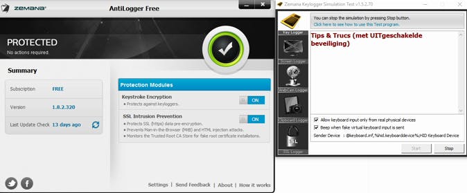 Overigens kun je de werking van deze anti-keylogger ook testen door middel van een simulator, waarbij je het resultaat van ingeschakelde en uitschakelde keylogger-protectie vergelijkt.