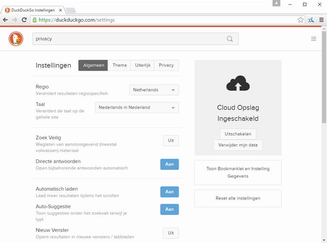 Een nadeel van DuckDuckGo is dat je bij zoektermen die bijvoorbeeld in het Nederlands hetzelfde zijn als in het Engels (denk aan een term als 'privacy'), uitsluitend Engelstalige hits krijgt. Dat kun je echter bijsturen via het knopje Op regio filteren, waarna je Netherlands selecteert. Via het hamburgerknopje kun je ook allerlei instellingen vastleggen. Wil je die op meerdere toestellen bewaren, ga dan naar Geavanceerde instellingen en kies Instellingen opslaan bij Cloud Opslag, waarna je een goed wachtwoord invult. Op een andere pc hoef je nu maar Instellingen laden te selecteren en hetzelfde wachtwoord in te vullen: je instellingen zetten zich dan ook daar door.