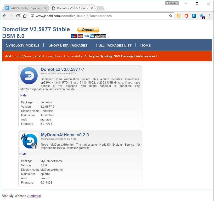 Wil je Domoticz op een nas draaien, dan ben je op dit moment beperkt tot de merken Asustor en Synology. Daarnaast wordt ook een Freenas-omgeving ondersteund. Asustor biedt het Domoticz-package direct in de appstore aan, klaar om te installeren. Synology niet, daarvoor moet een alternatieve bron voor installeerbare pakketten worden toegevoegd via Package Center / Instellingen / Pakketbronnen / Toevoegen. Er staat een Domoticz-package op de bekende website www.synocommunity.com, maar die is op het moment van schrijven verouderd. Open daarom eerst de webbrowser en ga naar www.jadahl.com. Klik onderaan de pagina bij Download op de meest recente Stable-versie voor de versie van DSM op jouw nas. Klik dan op de volgende pagina op het model Synology en kopieer dan de url in de rode balk. Schakel weer over naar de Synology en plak de url in het vak Locatie en klik op OK. Sluit de instellingen en klik in de Package Center op Gemeenschap. Hier staat nu de Domoticz package van jadahl.com.