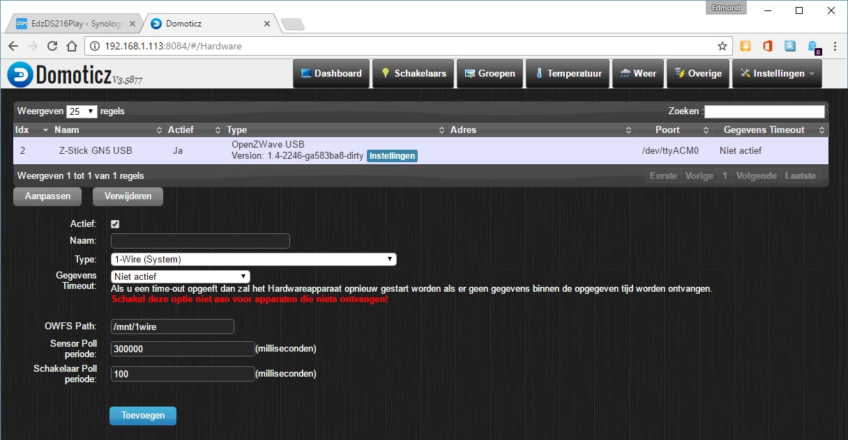 Het voordeel van de Jadahl-versie is dat deze meteen ook de benodigde OpenZwave-driver installeert. Deze is nodig om de nas te laten communiceren met de domotica-hardware via het Z-wave protocol. Hiervoor is nog wel een Z-wave compatibele transceiver nodig zoals de Aeotec Z-Stick Gen5 van Aeon Labs, maar ook andere RFXcom of RFLink-hardware wordt ondersteund. Belangrijk is dat de transceiver via usb op de nas aangesloten kan worden. Van deze opties kost de goedkoopste rond de 50 Euro, de andere modules zitten iets boven de 100 Euro.