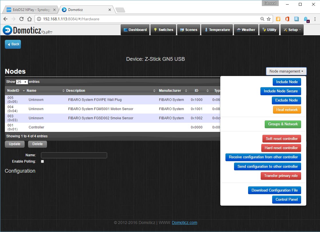 Staat de domoticahardware klaar dan is het tijd om deze met Domoticz op de nas te verbinden. Klik in Domoticz op Setup / Node management / Include Node. Domoticz begint nu te zoeken naar domoticacomponenten. De meeste domoticaproducten - zoals in dit artikel de Fibaro-componenten - laten zich eenvoudig vinden en worden direct door Domoticz herkend.
