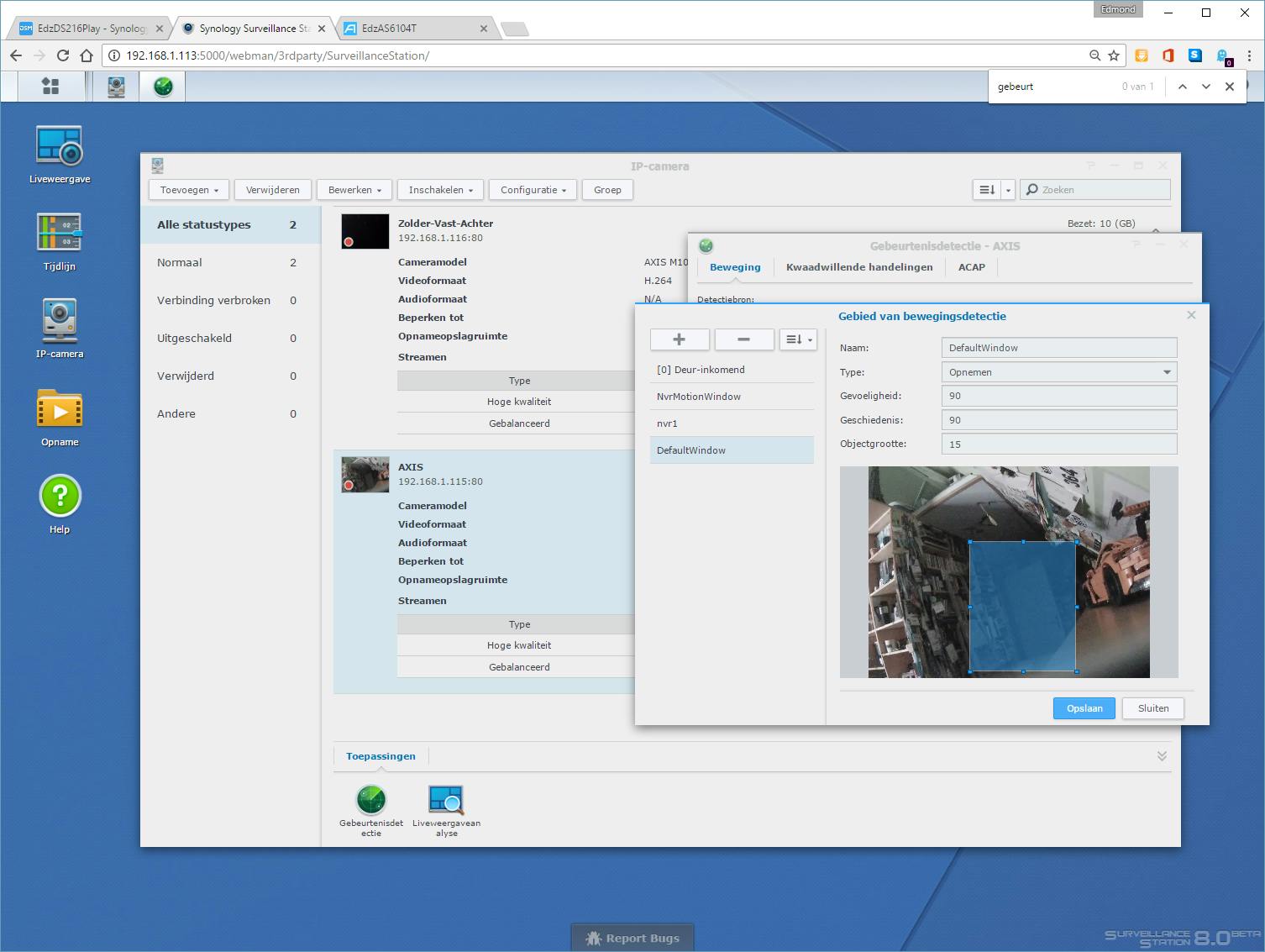 Met bewegingsdetectie wordt bedoeld dat de camera zelf de beelden analyseert en wanneer het beweging - of eigenlijk verandering - waarneemt, dat het dan een actie onderneemt. Dat kan zijn het starten van een opname maar ook het versturen van een waarschuwingsbericht. De bewegingsdetectie kun je laten uitvoeren door de camera of door de nas. Bewegingsdetectie is behoorlijk processorintensief en vergt continue aandacht van de nas. Daarom is het algemene advies het zo veel mogelijk door de ip-camera zelf te laten uitvoeren. Selecteer hiervoor de ip-camera en kies bij Synology Gebeurtenisdetectie / Detectiebron. Je kunt kiezen tussen Uitschakelen als je geen bewegingsdetectie wilt gebruiken, Door camera als je de camera de bewegingsdetectie wilt laten uitvoeren en Door Surveillance Station als de nas dit klusje moet klaren. Bij QNAP vind je dit onder Instellingen / Gebeurtenis Actie Regels / Toevoegen. Selecteer als Gebeurtenisbron de Camera en bij Voorval Camerabewegingsdetectie. Er zijn allerhande aanvullende opties zoals het detectiegebied, het deel van de opname dat je in bewaking wilt hebben, de gevoeligheid en de drempel en nog veel meer.