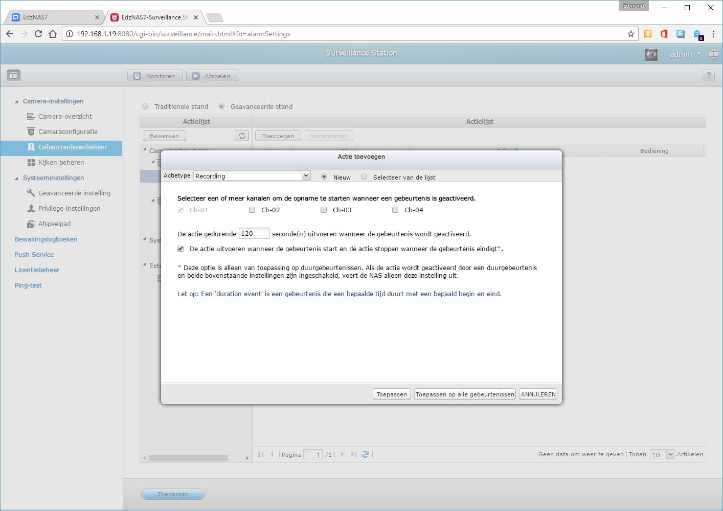 Wil je ook dat er alarm geslagen wordt wanneer de bewegingsdetectie een verandering waarneemt, dan moet je die actie apart configureren. Dit kan opnieuw zowel op de ip-camera als op de nas. Hier loopt de werkwijze per nas wel erg uiteen, net als het aantal opties. QNAP maakt om het overzichtelijk te houden onderscheid tussen een Traditionele stand met de belangrijkste opties en een Geavanceerde stand met alle opties. Bij de laatste kun je behalve de bekende bewegingsdetectie ook alarm laten slaan als de nas de verbinding met de camera kwijt is of het opnemen mislukt.