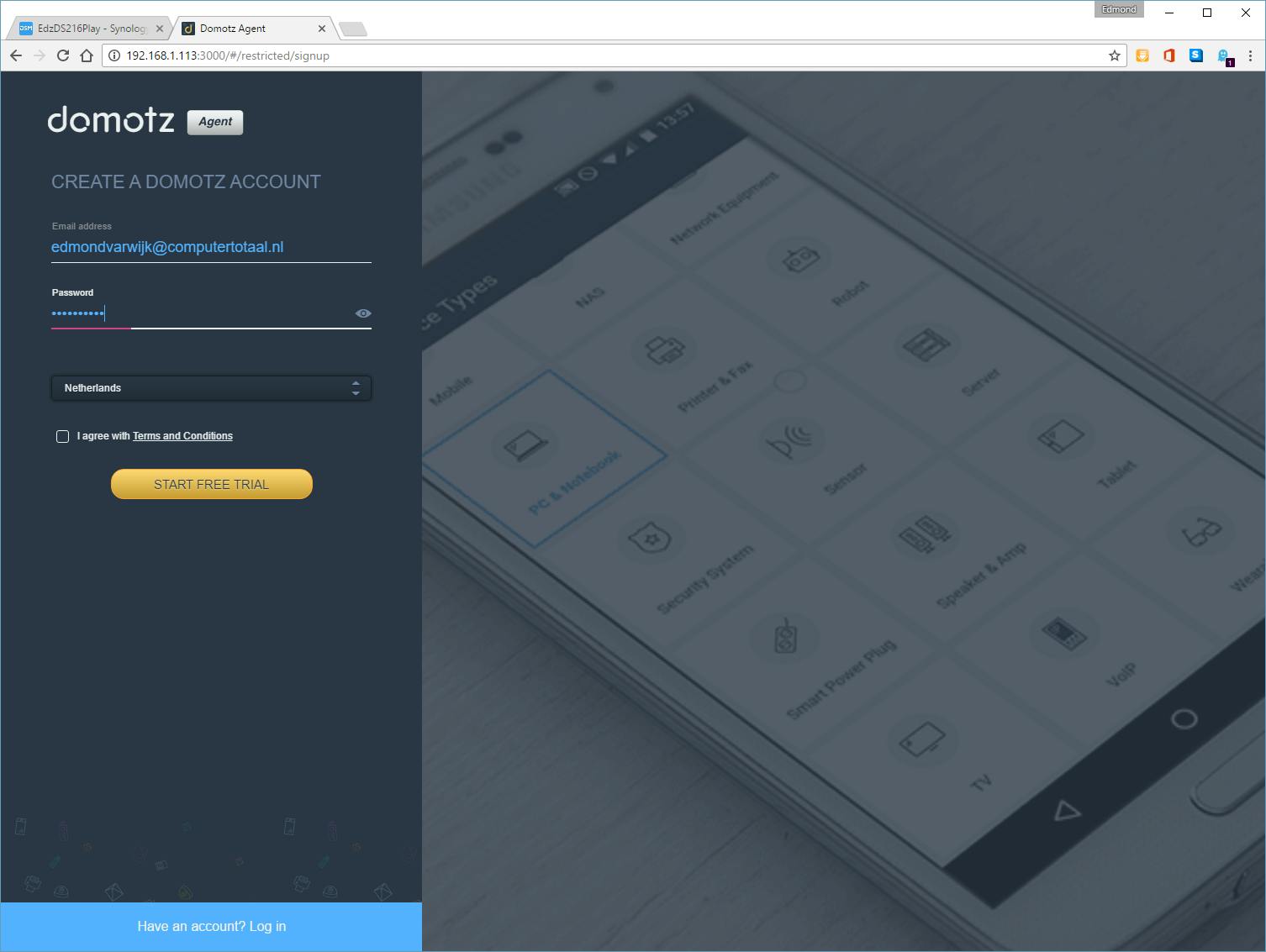 Behalve huis en haard bewaken kan een nas ook prima het thuisnetwerk in de gaten houden. Daar is het apparaat zelfs bij uitstek geschikt voor, het beschikt over voldoende geheugen en processorkracht en staat als een van de weinige apparaten ook nog eens bijna altijd aan. Een goede app om hiervoor te gebruiken is Domotz. Een verwarrende naam, want met domotica heeft het maar heel weinig te doen behalve dat het ZigBee-apparatuur kan monitoren en binnenkort ook Z-Wave. Domotz is niet gratis; na de 30 dagen proefperiode betaal je 36 euro per jaar voor het bewaken van een oneindig aantal netwerkapparaten in je netwerk. Installeer Domotz vanuit de app-store op de nas. Log daarna in en maak een account. Kies Start Free Trial als je eerst 30 dagen de toepassing wilt gebruiken.