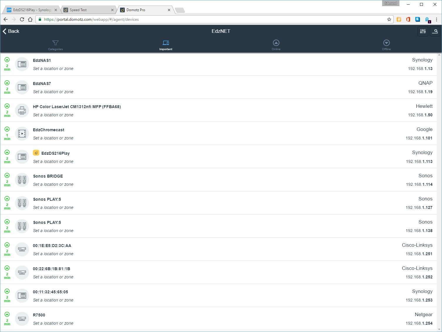 Ingelogd wil Domotz een aantal zaken weten zoals de naam van je netwerk, de locatie en of het een Home of Office netwerk betreft. Klik daarna op Activate your agent. Domotz start daarna een scan en inventariseert de apparaten in het thuisnetwerk. Klik op Done als de scan is afgerond. Domotz laat je nu een overzicht zien van de gevonden apparaten. Je kunt op elk apparaat doorklikken en aanvullende gegevens opgeven. Vul bij Name een logische naam in voor het apparaat, bij Location de ruimte in huis, en bij Zone de verdieping in huis. Ook kun je per apparaat aangeven hoe belangrijk deze is. De standaardinstelling is Indifferent voor apparaten met geen of minder belang. Kies bij apparaten die extra aandacht verdienen voor Important. De overige informatie wordt door Domotz automatisch verzameld en zal zich na enkele dagen steeds verder vullen. Elke verandering in de status van een apparaat wordt bijgehouden en is later terug te zien in Times changes en onder History.