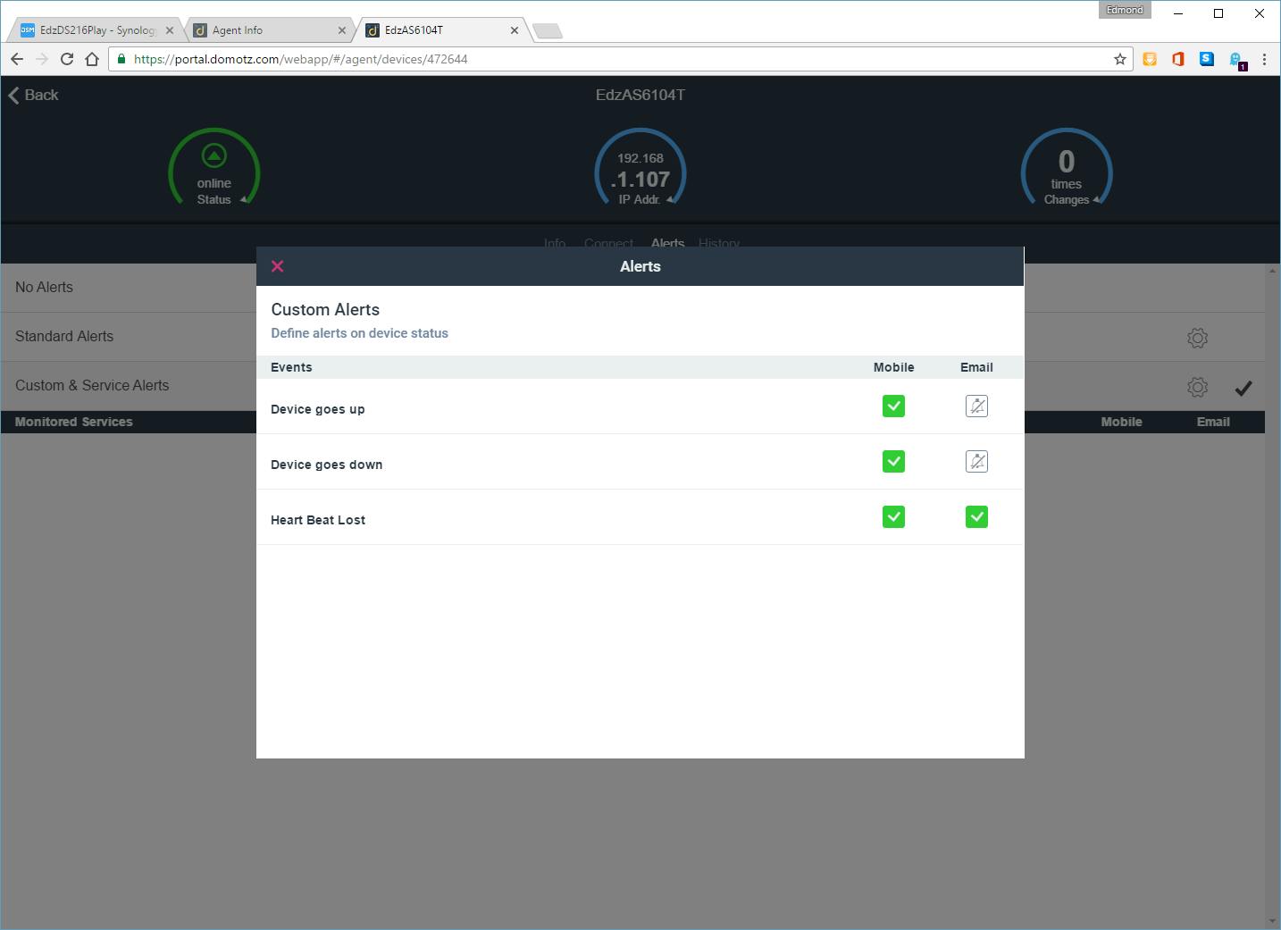 Behalve dat Domotz alle veranderingen monitort, kun je ook een alert ontvangen van een wijziging van de status van een apparaat. Bijvoorbeeld als een apparaat aangaat of juist uit, of wanneer het de verbinding verliest. Hiervoor ga je naar Alerts. Er is een standaard profiel voor alle apparaten, dit kun je wijzigen via Standard Alerts. Wil je per apparaat beslissen, kies dan Custom & Service Alerts. Vink de opties aan, wil je de meldingen ontvangen op je smartphone of tablet kies dan voor Mobile, wil je liever een bericht per e-mail kies dan Email.